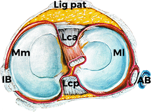 Letztere Aufgabe erfüllen sie im Zusammenspiel mit den Bändern: Innenband (IB) [Ligamentum collaterale tibiale / mediale], Außenband (AB) [Ligamentum collaterale fibulare / laterale], vorderem (Lca) [Ligamentum cruciatum anterius] und hinterem (Lcp) [Ligamentum cruciatum posterius] Kreuzband.