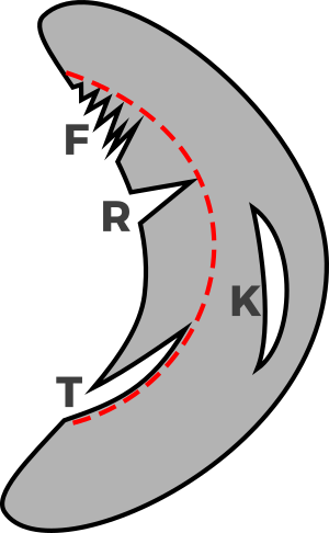 Es gibt ganz verschiedene Riss-Formen. Ein verschlissener Meniskus franst häufig aus (im Bild F). Daneben kommen Radiär- (R) und Tangential-Risse (T) vor. Eine Sonderform ist der sogenannte Korbhenkel-Riss (K).
