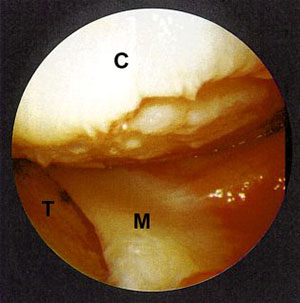 Im Gegensatz zum Aspekt eines normalen Kniegelenkes ist hier, beim verschlissenen Kniegelenk, der Knorpel des Oberschelknochens (C) [Condylus] erheblich aufgerauht. Der darunter liegende Meniskus (M) ist an seiner Basis von Schleimhaut überzogen, die durch verstärkte Durchblutung gerötet ist – Zeichen einer Schleimhautentzündung [Synovitis].