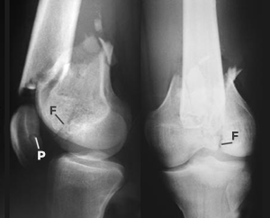 Hier das Röntgenbild einer schweren Knochenverletzung des Kniegelenkes. Der Bruch des Oberschenkelschaftes fällt sofort ins Auge. Weniger offensichtlich sind die Brüche an der Kniescheibe [Patella] (P) und an den Oberschenkelroffen [Femurkondylen] (F). Solche Haarrisse [Fissuren] können leicht übersehen werden.