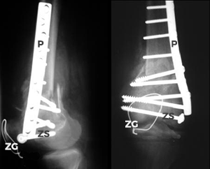Die anatomische Rekonstruktion mittels Platte (P), Zugschrauben (ZS) und Zuggurtungsdraht (ZG) ist aufwändig aber unbedingt nötig, da sonst ein frühzeitiger Gelenkverschleiß [posttraumatische Arthrose] resultiert.