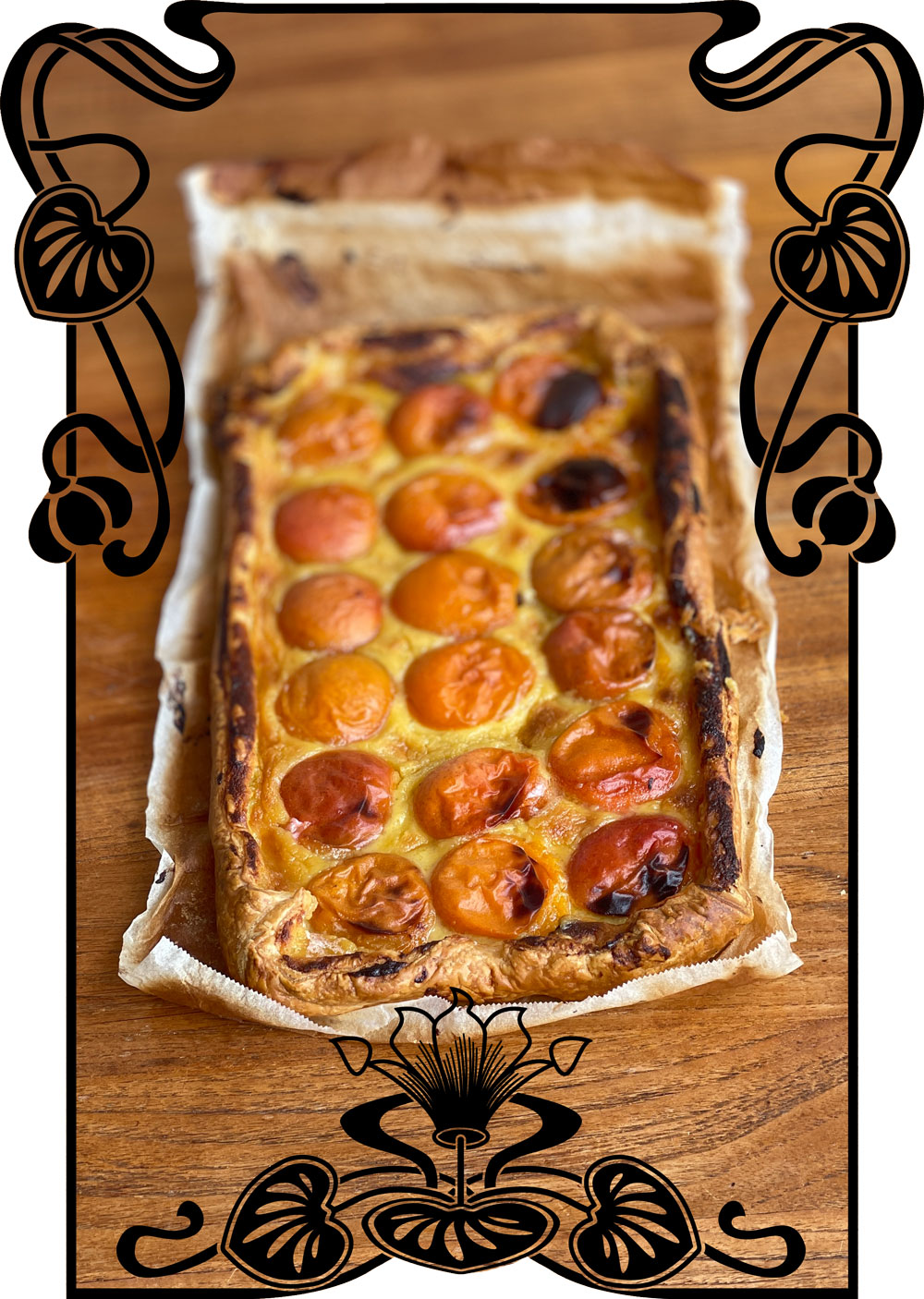 Den Blätterteig ausrollen. Die lauwarme Creme bis an den Rand verstreichen, die Teigränder etwas einschlagen. Die halbierten Aprikosen dicht an dicht auf der Creme verteilen. Mit Hilfe des vorhandenen Backpapiers auf ein Backblech legen und bei 200° etwa 40 Minuten lang backen. Marmelade dünn darauf verstreichen.