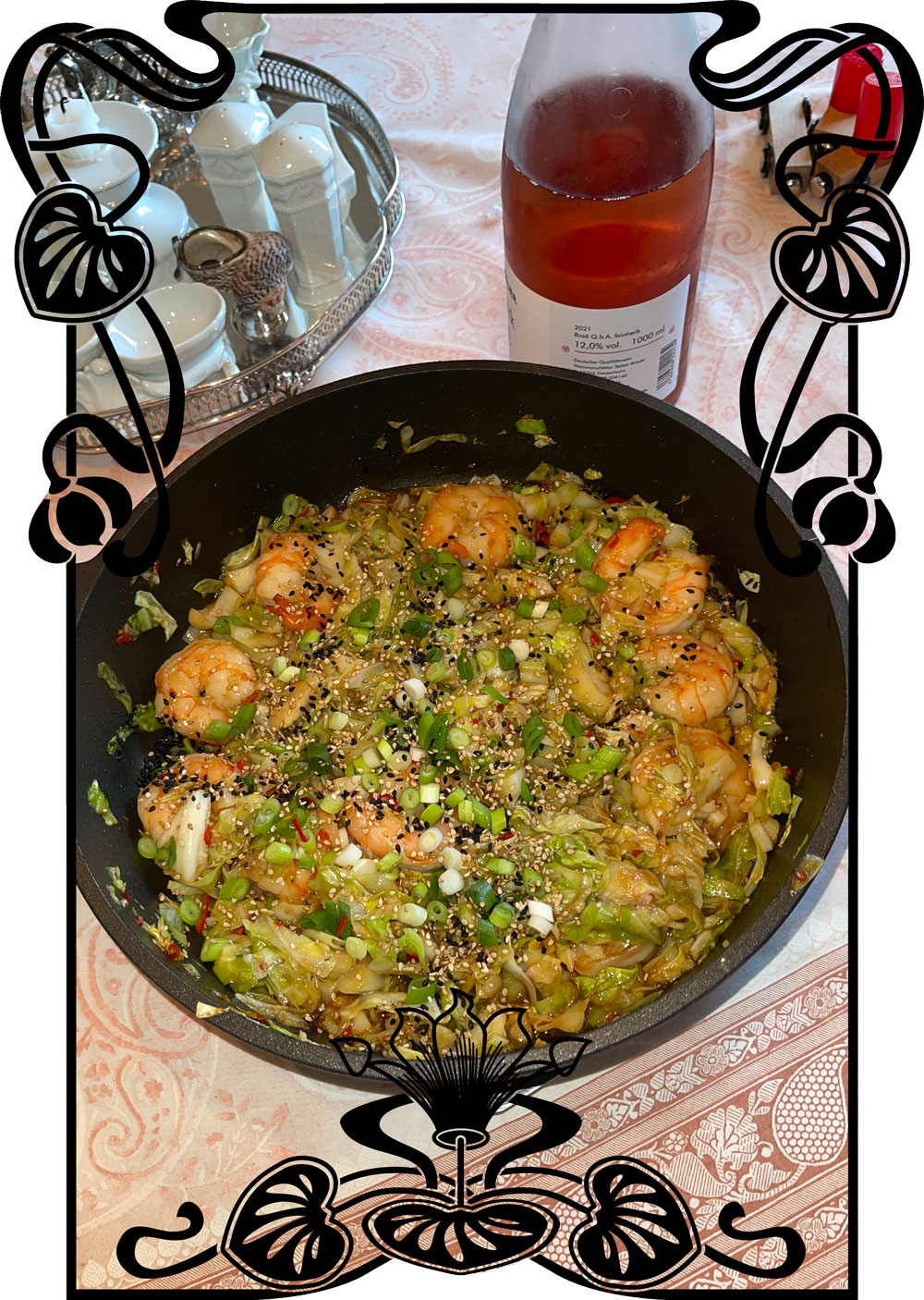 Jetzt Spitzkohl in die Pfanne geben, anbraten. Dann die Saucenmischung und die King Prawns dazu geben und köcheln, bis die Sauce leicht eindickt.