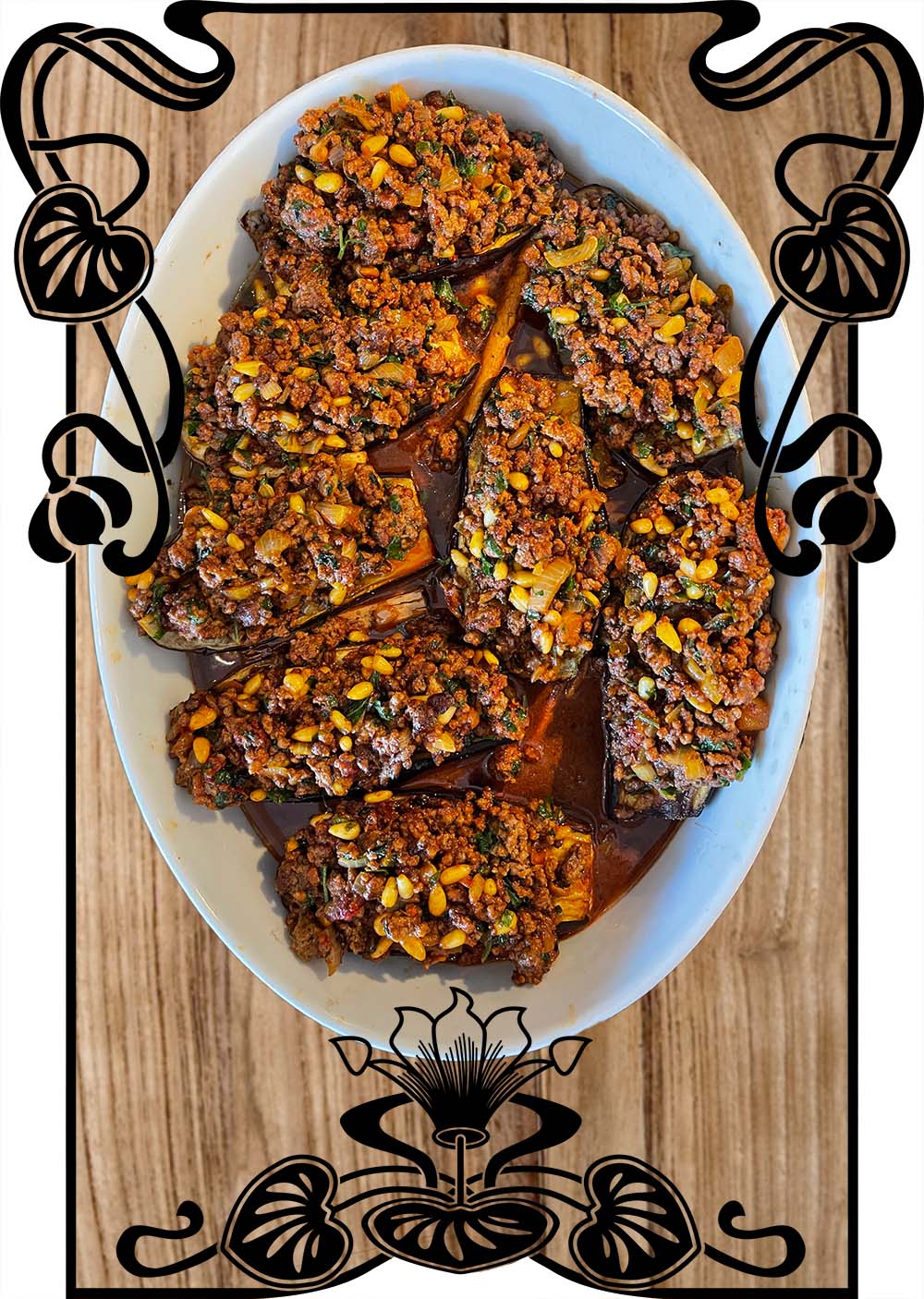 Den Backofen auf 195°C stellen. Fleisch und Auberginen (eventuell in mehreren Lagen) in einer ofenfesten Form übereinander schichten, die Form gut mit Alufolie verschließen und für ca. 1 bis 1½ Stunden in den Ofen schieben. Kocht die Sauce zu stark ein, etwas Wasser hinzufügen.