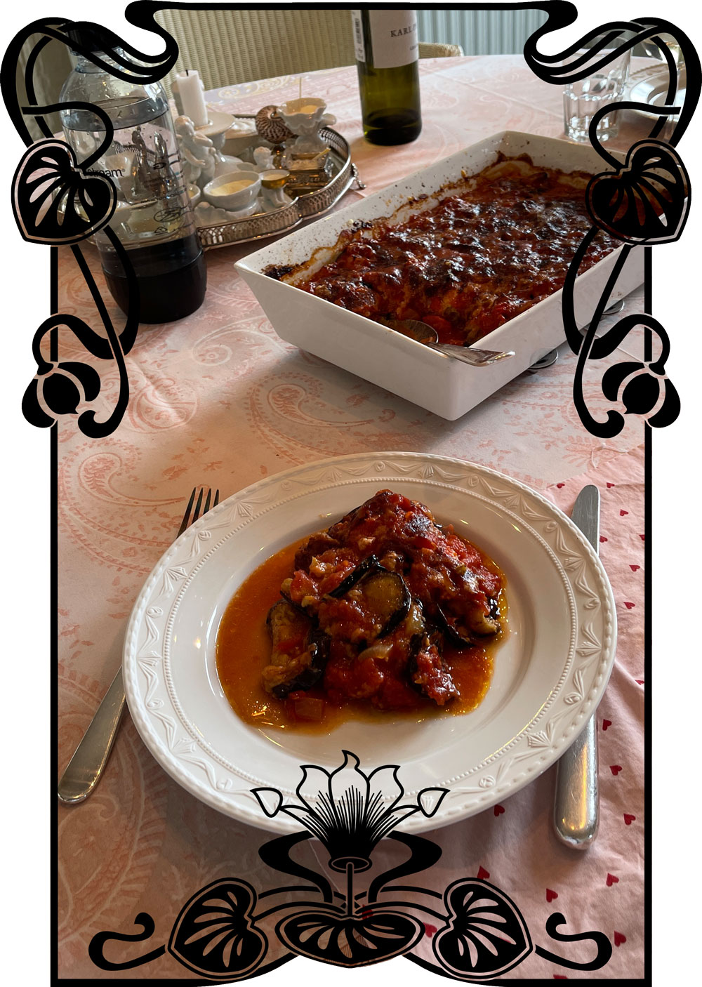 Den Boden einer Auflaufform mit der Tomatensoße bedecken. Darauf eine Lage Auberginenscheiben geben. Darauf circa ein Drittel des kleingeschnittenen Mozzarella geben. Darauf Tomatensoße geben und mit frisch geriebenem Parmesan bestreuen. Diesen Vorgang in der jeweils umgekehrten Reihenfolge wiederholen, bis alles aufgebraucht ist. Mit Tomatensoße, Mozzarella und Parmesan abschließen.