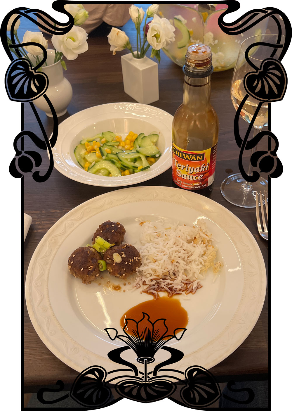 Fleischbällchen mit der restlichen Teriyaki-Sauce beträufeln und mit Sesam und den Frühlingszwiebeln bestreuen.