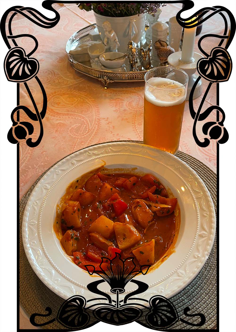 Zwiebel schälen und in Spalten schneiden. Knoblauch schälen und hacken. Paprika waschen, entkernen und in Streifen schneiden. Kartoffeln schälen und in fingerdicke Stücke schneiden.