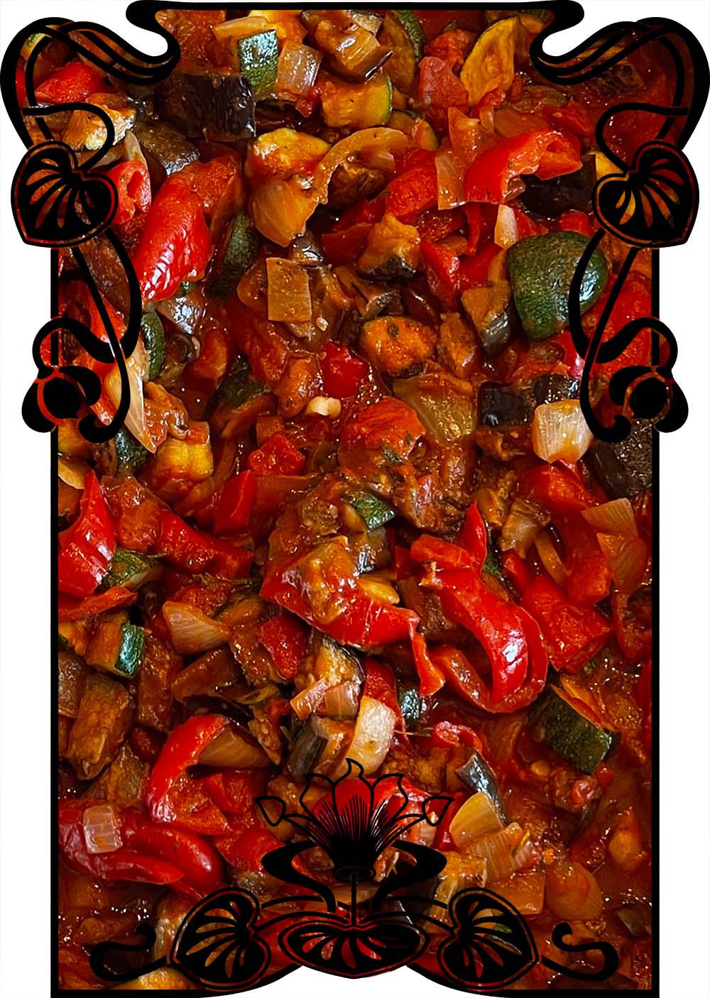 Alles einzeln in Öl anbraten, zuerst die Auberginen, dann alles in einem großen Topf mischen, aufköcheln, dann Kräuter zugeben und schließlich mit Pfeffer, Salz, Zucker und Balsamico-Essig abschmecken@.