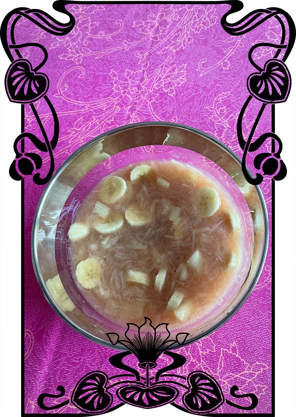 Rhabarber putzen und in Stücke schneiden. Mit Zucker, Vanillezucker und Weißwein mischen und köcheln. Speisestärke in etwas Wein anrühren und zum Rhabarber geben, wenn der zu zerfallen beginnt. Aufkochen. Etwas abkühlen lassen und dann die Bananen ich Scheiben darunterrühren.