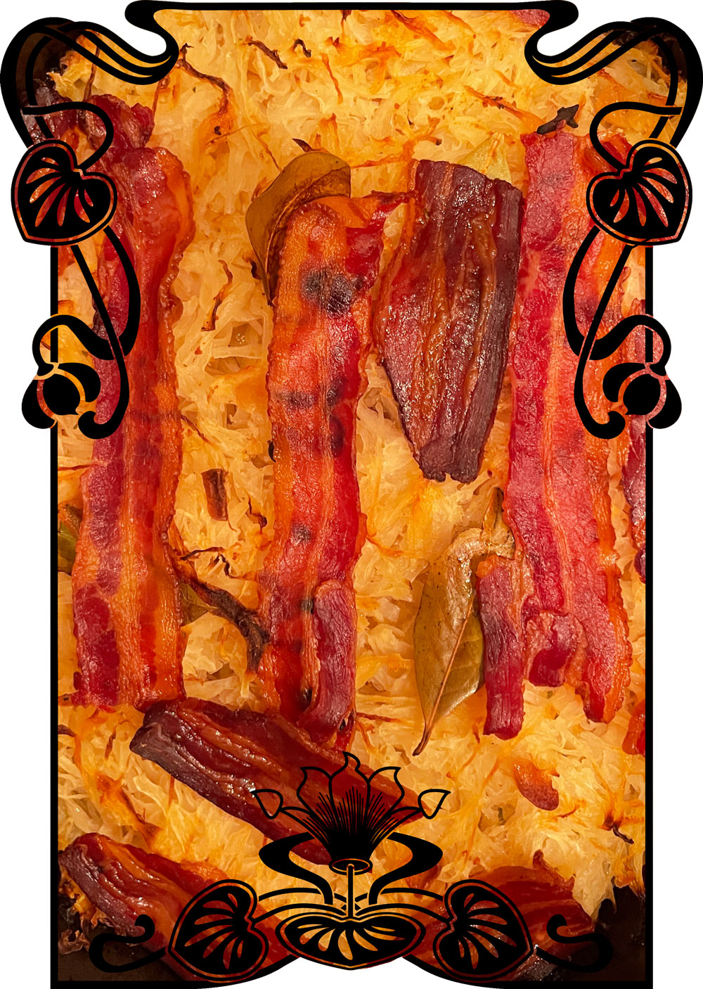 Topf mit der Hälfte des Frühstückspecks in Scheiben auslegen, darauf die Hälfte des Sauerkrauts, dann die Hälfte der Gewürze. Darauf die Mett-Enden in Scheiben und das Gulasch. Hierauf kommen die Kartoffeln in Scheiben und die Zwiebeln in Ringen und eventuell der Knoblauch. Dann den Rest Sauerkraut und dann die restlichen Gewürze aufschichten. Darüber den Weißwein und die Hühnerbrühe gießen. Das Ganze mit dem Rest Speck belegen und bei geschlossenem Topf bei 190º im Ofen ca. drei Stunden garen.