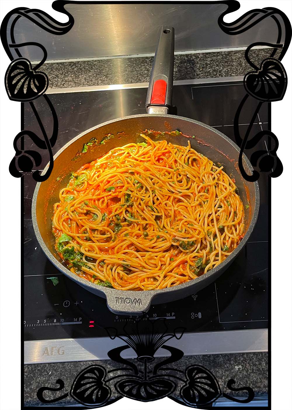 Die vorgegarten Nudeln zur Sauce geben und darin köcheln lassen, bis um die Nudeln herum eine sämige Sauce entstanden ist. Zuletzt die Petersilie hinzufügen.