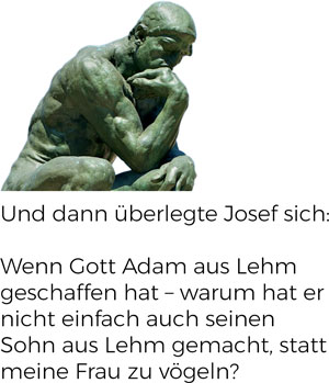 Dieser Mythos wirft eine Reihe von Fragen auf – nicht zuletzt für den Hahnrei Josef. Es scheint mir allerdings fraglich, ob der gute Mann tatsächlich derartige komplizierte Überlegungen anstellte; die Erklärung dieses Wunders