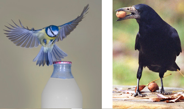 Ein weiteres Beispiel sind Krähen, die mit Hilfe von Autos Nüsse knacken: In Japan sind sie auf den Dreh gekommen, Nüsse bei Ampeln zu platzieren, um sie von Autos überrollen zu lassen. Bei Rotphasen machen sie sich dann über die Kerne her. Auch das ist ein Verhalten, das erlernt und nicht per Instinkt angeboren wurde.