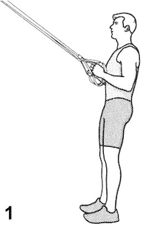 - Einen frontalen, schulterbreiten Stand mit Blick zu den Schlingen einnehmen. Die Fußspitzen zeigen nach vorn. Die Ellenbogen anwinkeln und die Hände vor dem Brustkorb halten. Der Oberkörper ist aufrecht, der Rücken gestreckt.