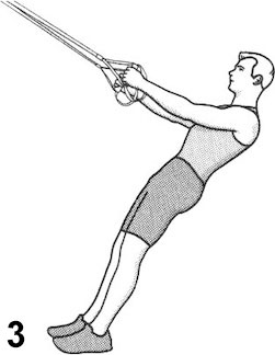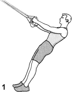 - Einen frontalen, hüftbreiten Stand zu den Schlingen einnehmen. So weit nach hinten lehnen, bis die Arme gestreckt sind. Mit aktivierter Rumpfmuskulatur den Körper in einer Linie halten. Die Schultern sind dabei tief.