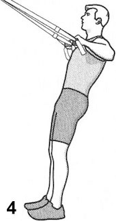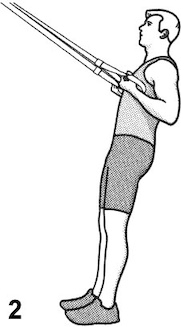 - So weit wie möglich nach oben ziehen, dafür die Arme beugen und die Ellenbogen eng am Oberkörper entlang führen. Die Handflächen zeigen in der Endposition nach oben.