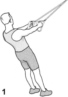 - Einen frontalen, hüftbreiten Stand zu den Schlingen einnehmen. So weit nach hinten lehnen, bis die Arme gestreckt sind. Mit aktivierter Rumpfmuskulatur den Körper in einer Linie halten. Die Schultern sind dabei tief.