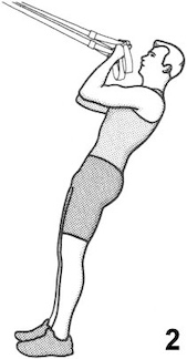 - So weit wie möglich nach oben ziehen, dafür die Arme beugen. Die Handflächen zeigen in der Endphase in Richtung Gesicht. Die Position der Ellbogen bleibt unverändert.